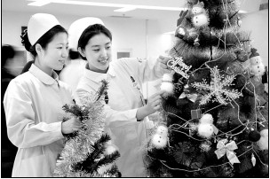 12月23日,在辽宁医学院附属第三医院健康体检中心,该院护士正在装饰圣诞树,给患者提供温馨的就医环境。